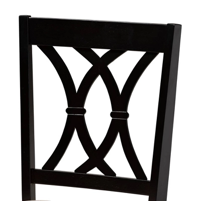 Crafted with the utmost attention to detail, the Reneau 7-piece dining set adds elegance to any dining space. Constructed from solid rubberwood in an espresso finish, this dining set includes one table and four chairs, each upholstered in a light polyester fabric that complements the dark wood finish. Designed to add both comfort and style to your dining space, each chair features a plush foam-padded seat, as well as a stunning cut-out design on its back. Tapered feet add a classic, refined touch. Built for long dinners with family and friends, the Reneau set is sure to enhance any dining experience. The Reneau 7-piece dining set is made in Malaysia and requires assembly. Chair dimensions: 37.4″ High x 17.7″ Wide x 20.5″ Deep; Seating Dimensions: 18.5″ High (from Floor) x 18.5″ Wide x 16.1″ Deep; Back: 18.9″ High; Legs: 16.9″ High