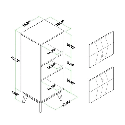 - Overall Dimensions: 47.00″ High x 19.00″ Wide x 16.25″ Deep; Storage Dimensions: Open Shelf: 17.50″ Wide x 14.75″ Deep x 9.25″ High; Storage Behind Doors: 17.50″ Wide x 14.75″ Deep x 14.25″ High; Legs: 6.75″ High;