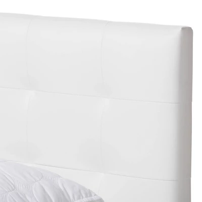 - Padded headboard is upholstered in faux leather