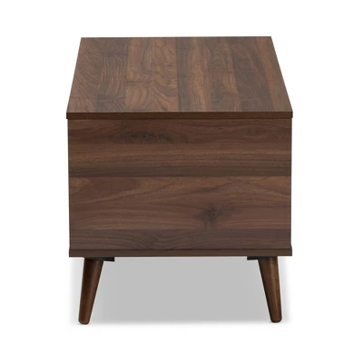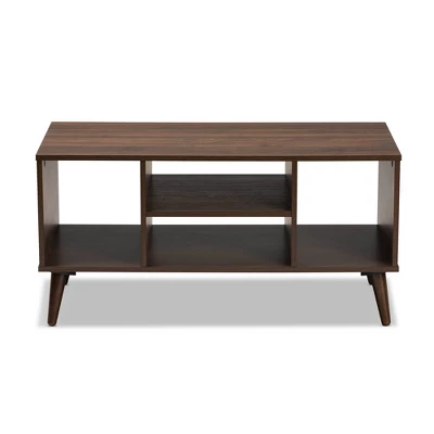 Add a dose of retro charm to your living space with the Linas coffee table. This wood coffee table features a spacious tabletop, perfect for a potted plant and a cup of espresso. Four open shelves provide ample space to display magazines, books, and more. Its walnut brown finish and angled legs add a cool, mid-century feel. The Linas coffee table is made in Malaysia and requires assembly.