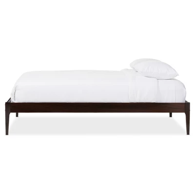 Inspired by mid-century modern design, the Bentley features simple and streamlined platform style bed frame. Constructed of eco-friendly solid rubberwood and poplar, the Bentley is built to last. Cappuccino finishing wood goes well with your entire home decor featuring mid-century modern design. Tapered legs lend sophisticated style to the bedroom. The Bentley platform style bed frame enables you to lift the height of your mattress in an economical way. The 15″ high platform bed height is perfect for any bed mattress, futon mattress (no box-spring needed). 10.5 Inch under clearance provides ample storage space. Simple, solid yet stylish, the Bentley is made in Malaysia and requires assembly.