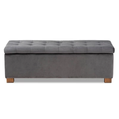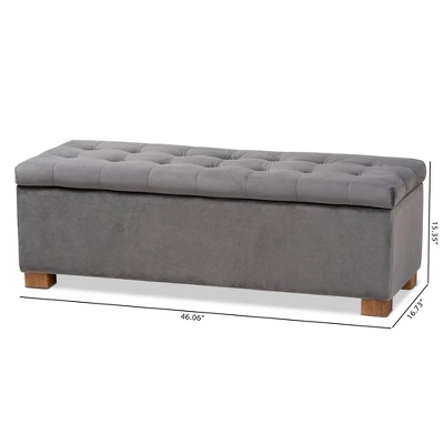 Perfect as a bed end bench for your bedroom or as an accent piece in your living space, the Roanoke storage bench combines handy seating and storage in a stylish way. Constructed from rubberwood, the bench features a cushioned seat upholstered in a soft velvet fabric that adds a dose of glamour to your space. The elegant grid-tufted top opens to reveal ample storage space, while walnut brown legs create a strong foundation. The Roanoke storage bench is made in Malaysia and requires leg assembly. Dimensions: 15.35″ High x 46.06″ Wide x 16.73″ Deep; Legs: 1.97″ High;