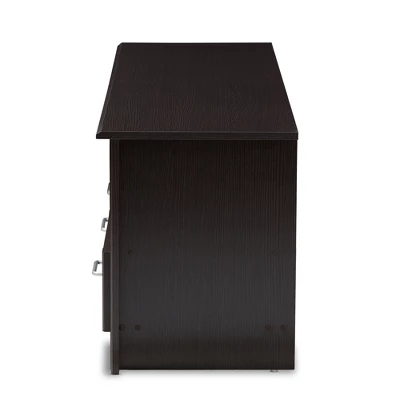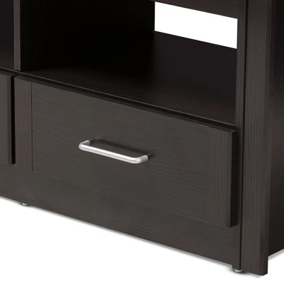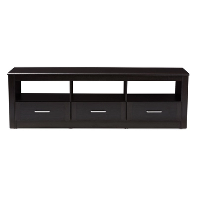 The Ryleigh TV stand is the practical and stylish solution to your living room’s organization needs. The modern and contemporary-inspired design features a clean, rectangular silhouette. The Ryleigh is finished in a wenge , mait easy to coordinate with a wide range of decor. The TV stand has a wide top space, ideal for multiple television set sizes. The Ryleigh has three open shelf spaces, with three pull-out drawers directly underneath. The drawers feature silver finished handles. All of this shelf and drawer space makes it easy to store entertainment media, such as DVDs and video games. Practical, stylish, and with plenty of open space for cord management, the Ryleigh can easily bring together your living room, rec room, or gaming set-up. Made in Malaysia, this TV stand requires assembly. Dimensions: 19.88″ High x 62.4″ Wide x 15.75″ Deep