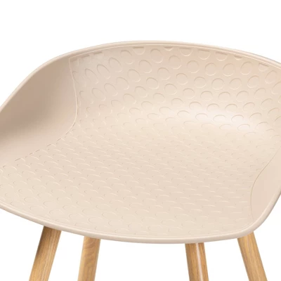 Bring a cool, contemporary look to your kitchen with the Mairi counter stool. Set on top of splayed legs, the Mairi features a round plastic seat that provides comfort and support during quick breakfasts or leisurely lunches. Circular imprints add a touch of texture and give the stool a mod feel. The beige finish on the seat is paired with a natural wood grain finish on the legs to give the Mairi a distinctively modern presence. The Mairi counter stool is made in China and requires assembly. Dimensions: 28.54″ High x 18.5″ Wide x 16.93″ Deep; Seating Dimensions: 13.39″ Wide x 16.14″ Deep x 23.82″ High (from Floor); Height (from Floor to Top of Arms): 26.97″ High; Back: 4.72″ High; Legs: 24.02″ High;